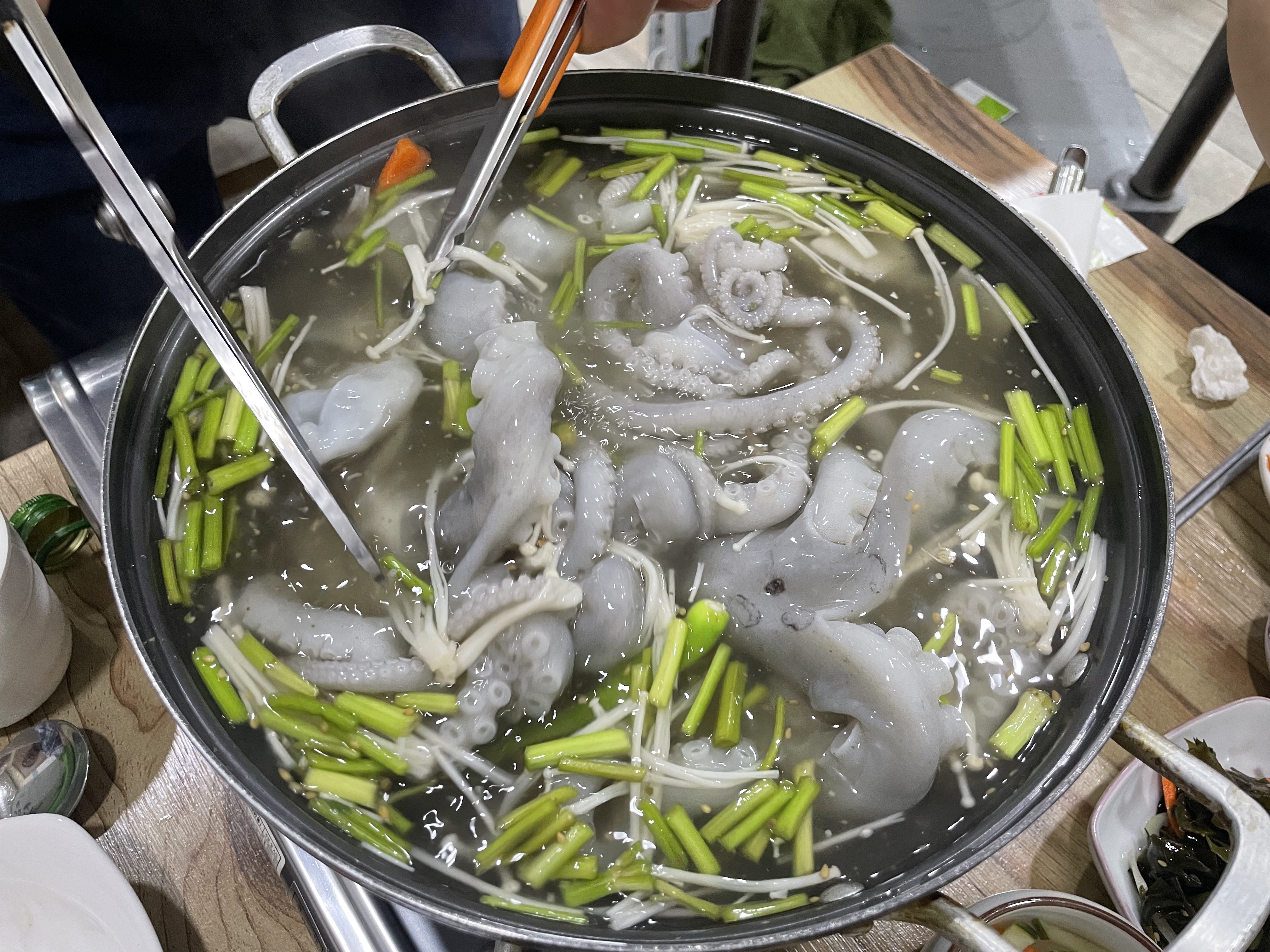 낙지 탕탕이를 한참 먹고 있었는데, 연포탕 육수가 나왔습니다. 육수가 한참 끓어지길 기다렸다가, 수족관에서 바로 잡은 엄청나게 큰 낙지를 육수에 넣었습니다.