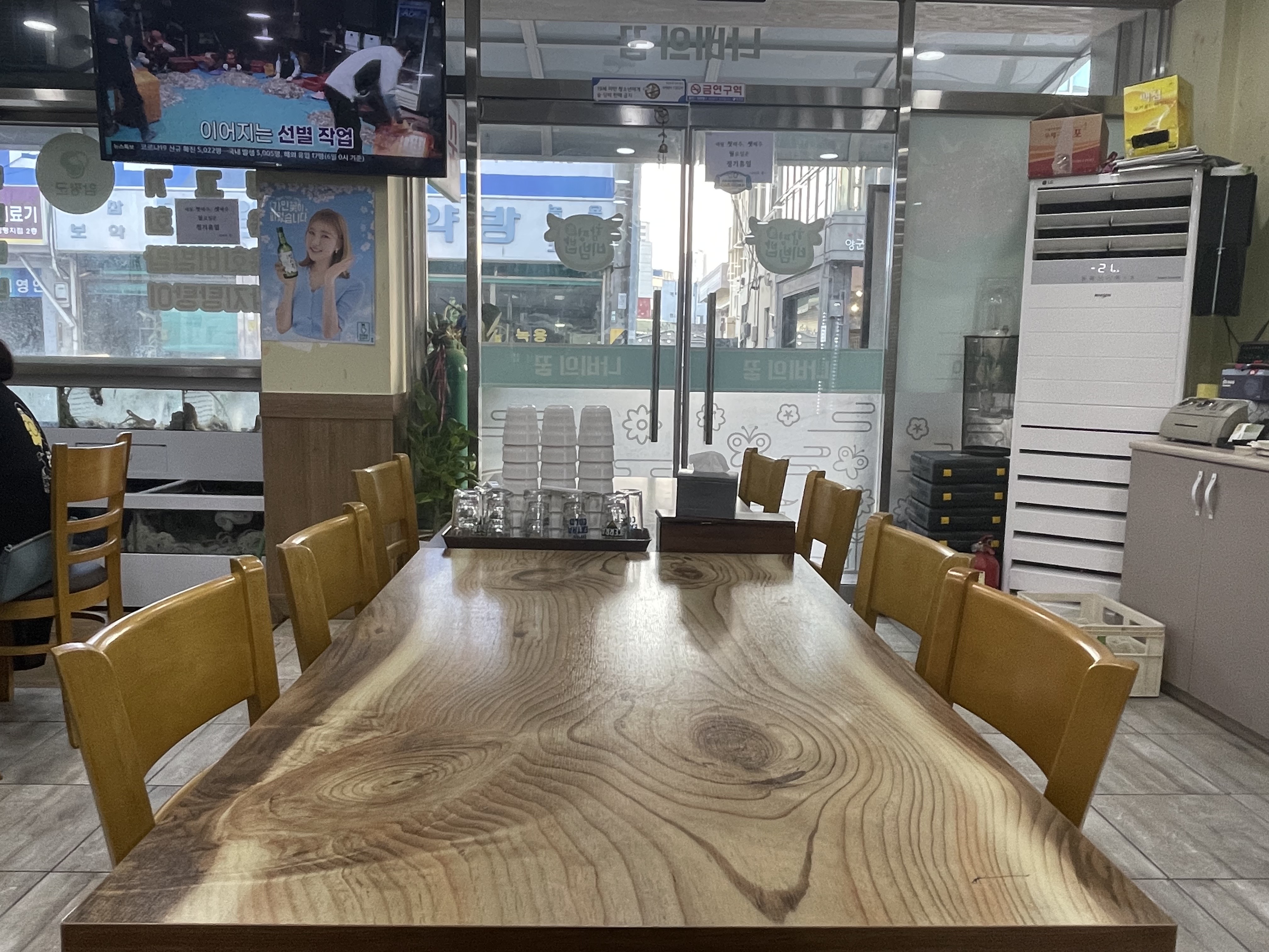 음식점 앞에 수족관이 있었는데, 음식점 문을 열고 안에 들어가보니 수조관이 연결되어 있습니다.