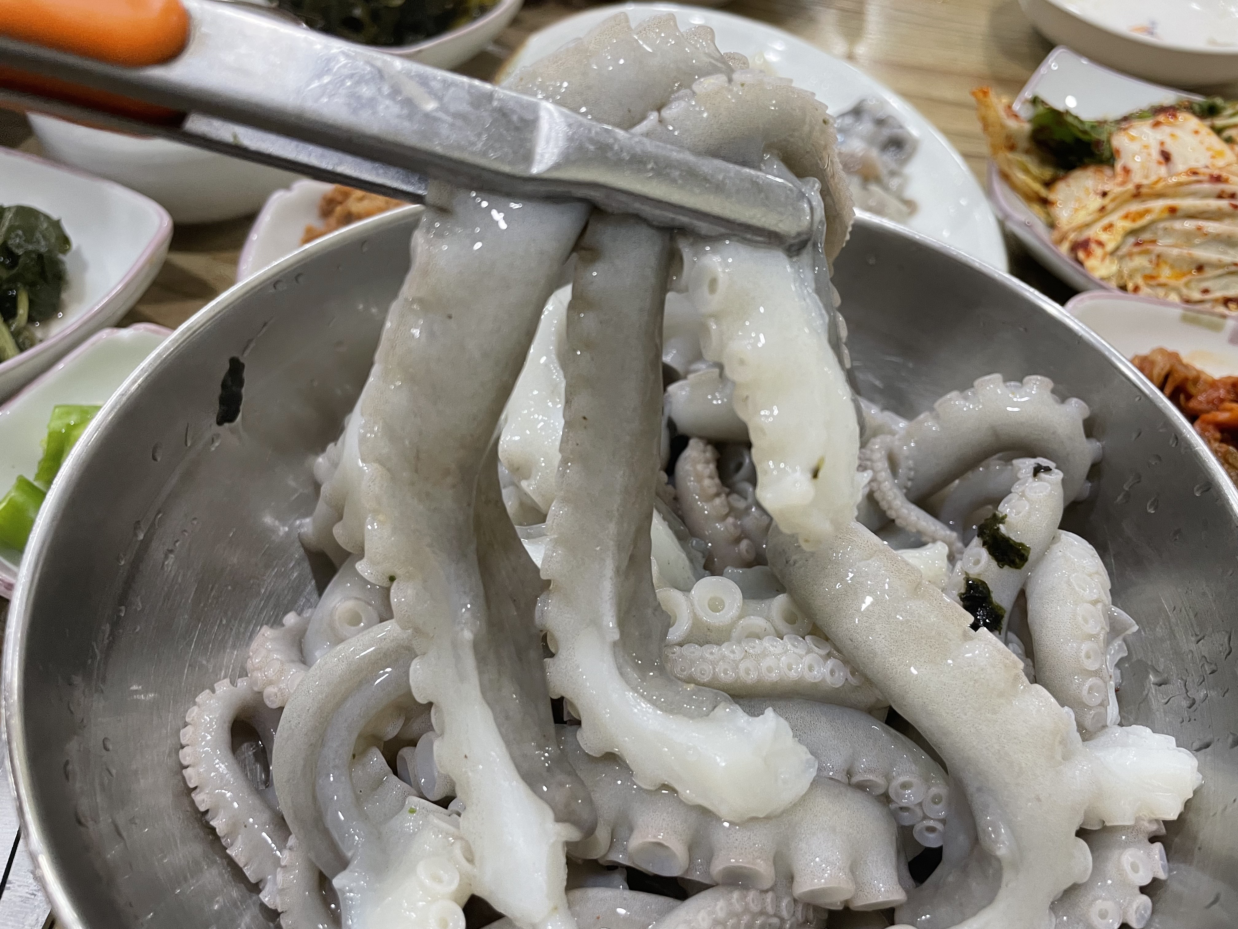 사장님께서 낙지연포탕은 펄펄 끓여먹는 것이 아니라 샤브샤브처럼 살짝 데처먹어야 한다고 말씀하시면서, 낙지가 어느정도 익자마자 바로 꺼내서 잘라줬습니다. 왜냐하면 국내산 낙지는 오래 끓일수록 맛이 없어진다고 합니다.