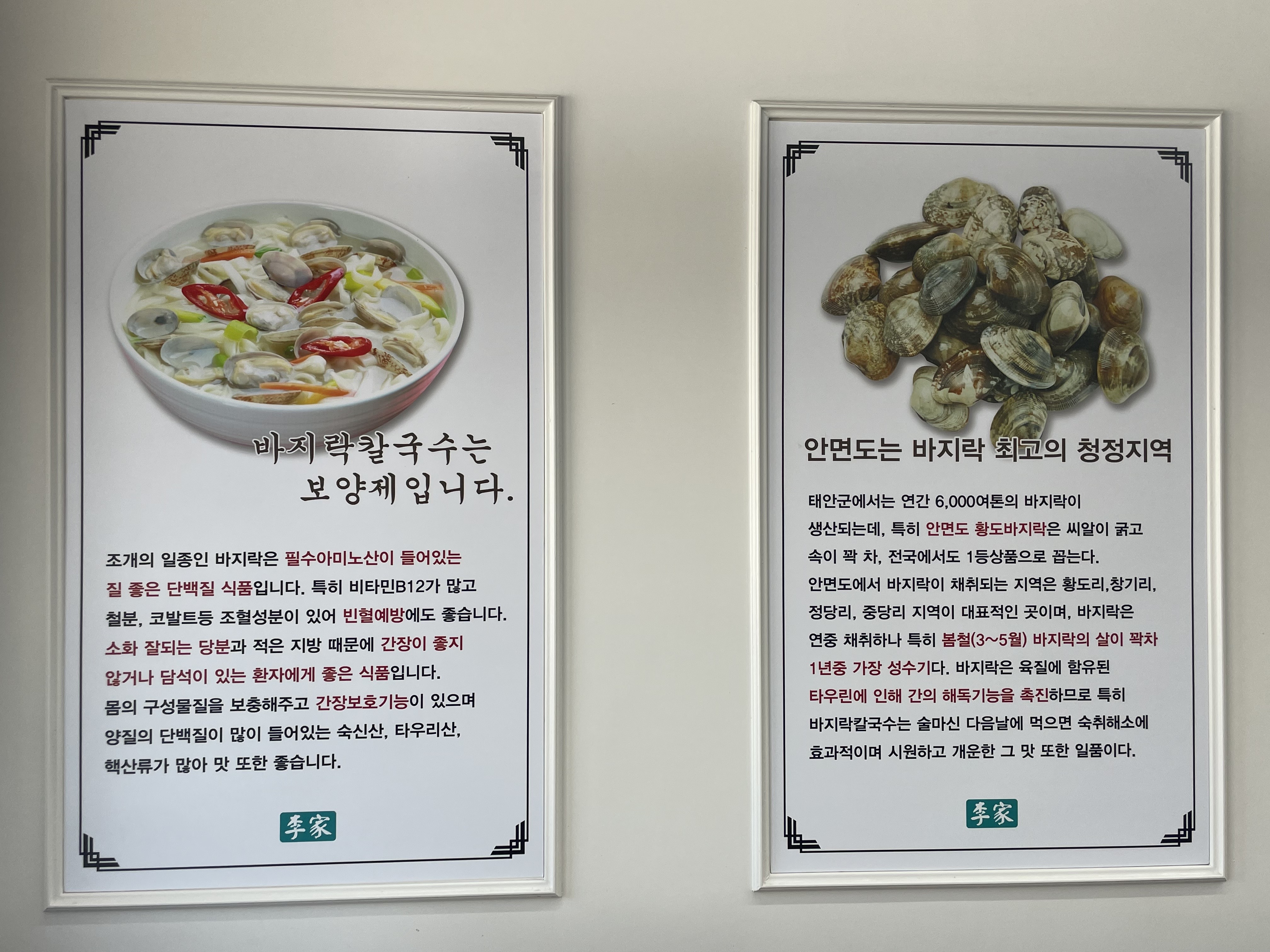 이가바지락칼국수는 최상급의 국내산 재료를 사용하고 태안군 안면도에서 생산되는 바지락을 사용한다고 합니다. 참고로 바지락은 봄철(3~5월)에 살이 꽉차서 가장 맛있다고 합니다.