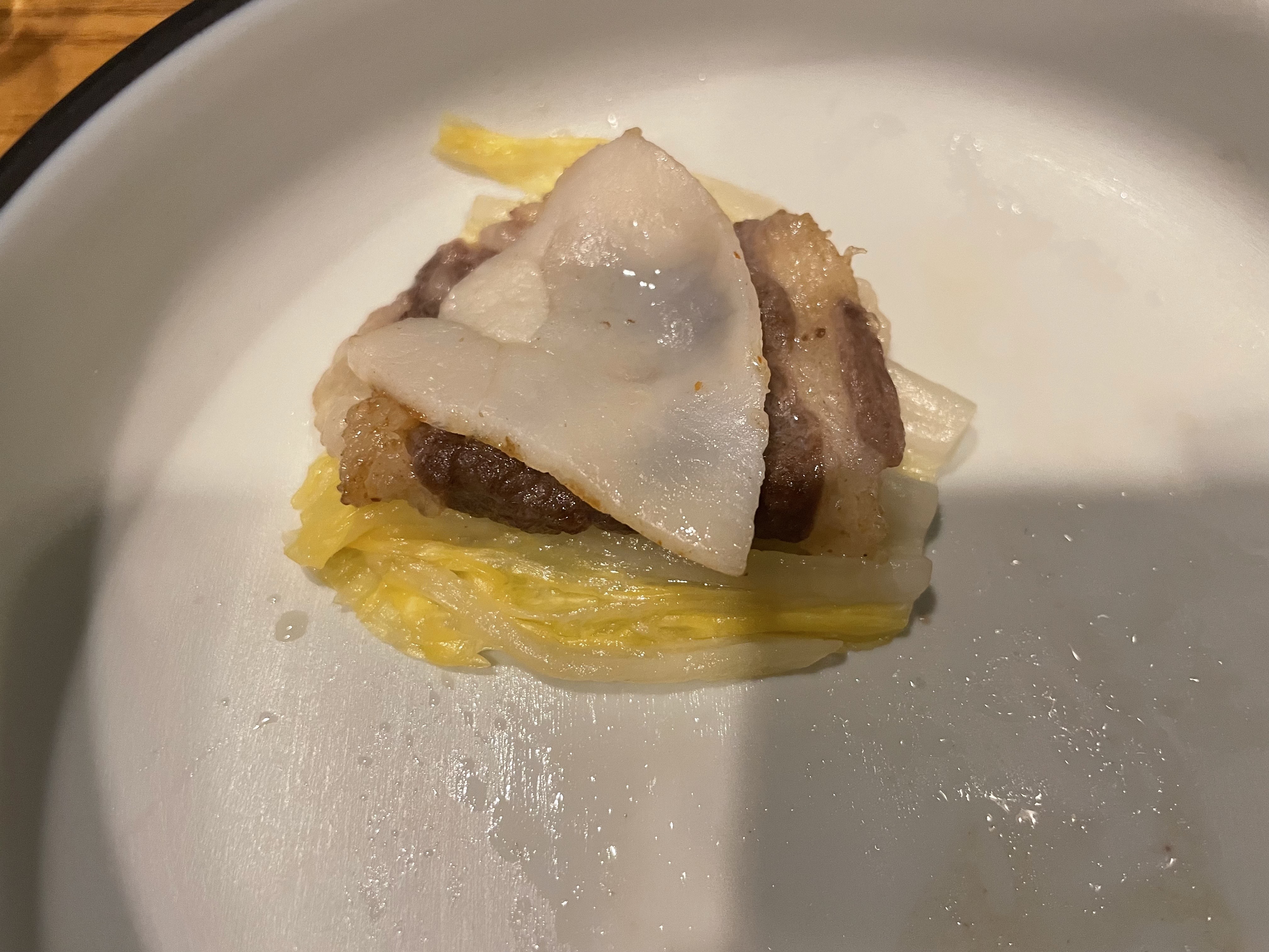 차돌과 관자 위에 백김치와 와사비를 조금 올려서 먹는 이 조합도 차돌과 관자 본연의 맛을 잘 느낄 수 있어서 좋았고 정말 맛있었습니다.