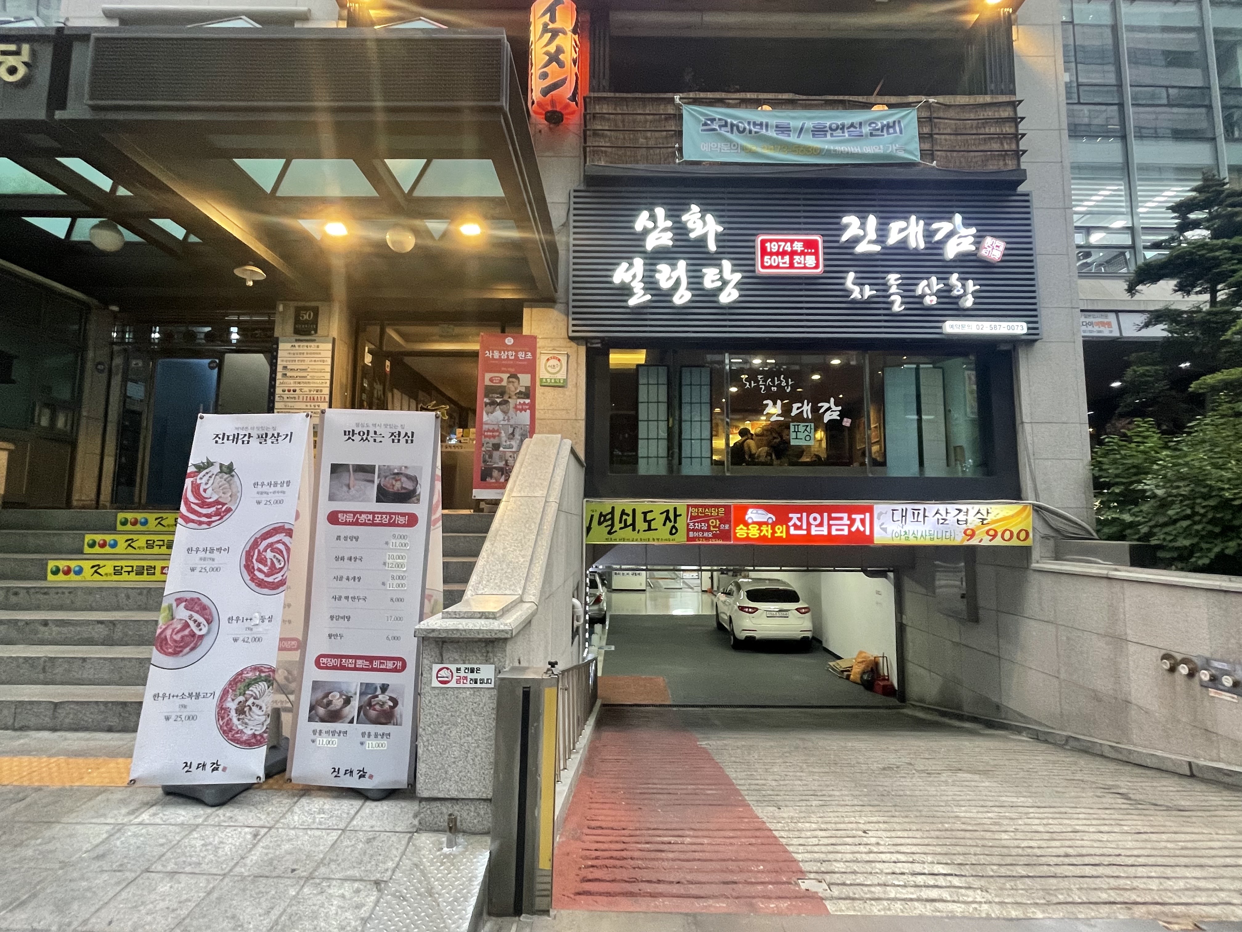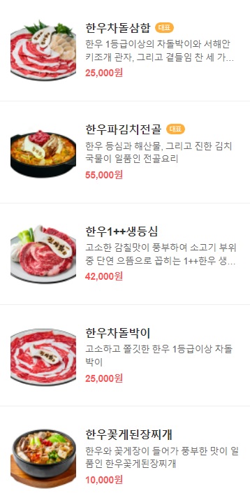 음식점 입구에는 한우 차돌삼합과 차돌박이, 한우 1++ 등심 등을 판매한다는 입간판이 있었는데, 사진 이미지로만 봐도 군침이 절로 삼켜지는 맛있는 메뉴들을 판매하고 있습니다. 점심에는 설렁탕과 해장국, 육개장 등의 메뉴도 판매하고 있습니다.
