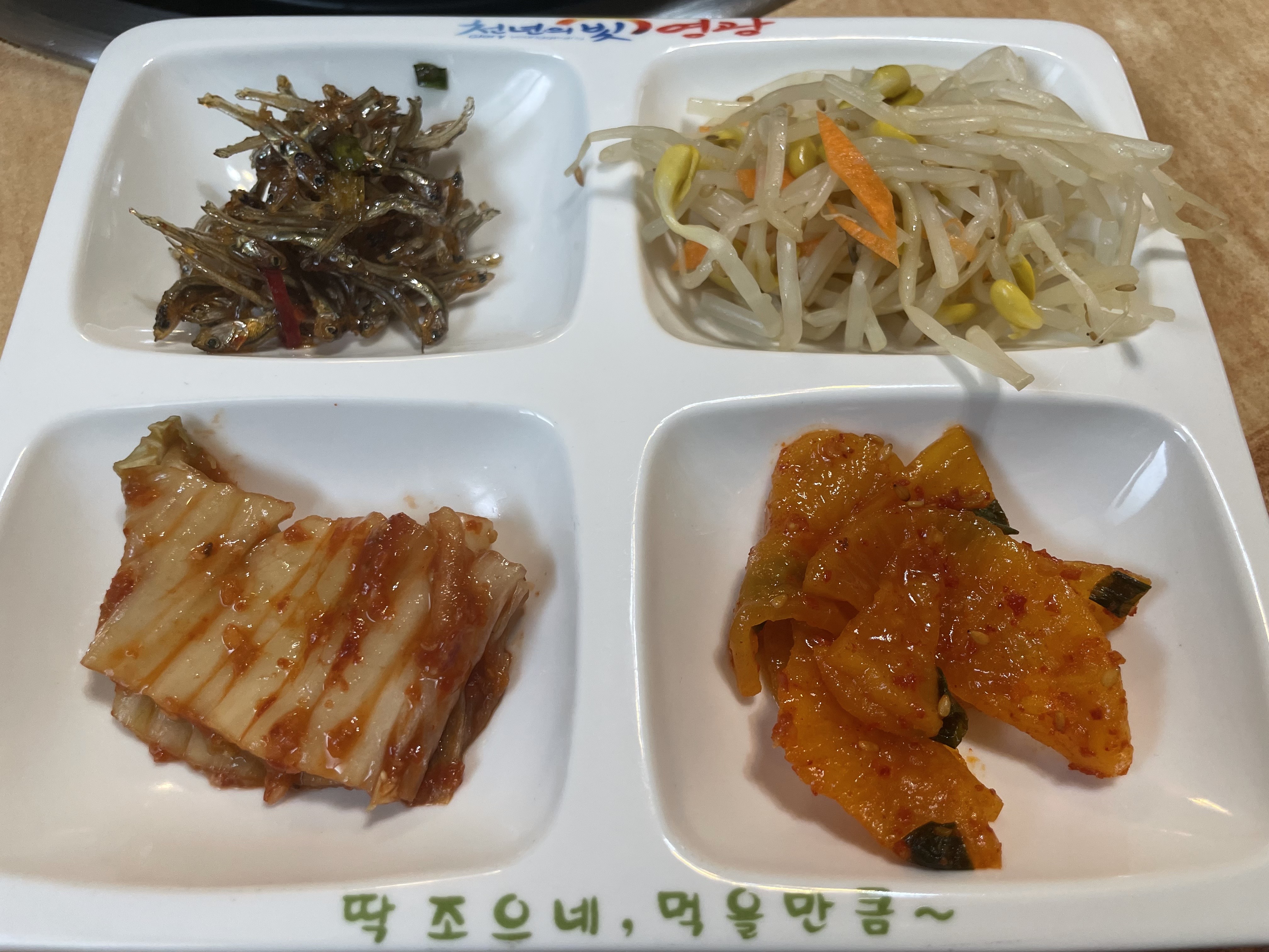 자리에 앉자 밑반찬(콩나물, 멸치 볶음, 김치, 단무지무침)이 나왔습니다. 밑반찬은 개인마다 식판 용기에 덜어져서 나오는데 깔끔하고 편해서 좋았습니다.